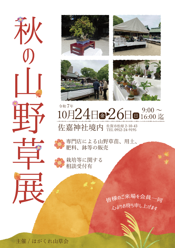 お知らせ 令和7年秋の山野草展 2025年10月19日 カテゴリ すべて お祭り お知らせ 授与品 最近の記事 令和7年秋の山野草展 (10/19) 拝殿内特別参拝を実施します (10/07) 令和8年正月臨時巫女募集 (10/07) 本日の神幸祭は雨天のため行列を中止し、神社にて祭典のみ行います。 (10/04) 10月の祭典・行事・催事のご案内 (10/01) 【お知らせ】10月のご祈願について (09/30) ご社殿改修工事が進んでいます (09/22) 令和7年神幸祭 (09/10) 令和7年秋の日峯さん (09/10) 9月の祭典・行事・催事のご案内 (09/01) 過去記事 2025年 2024年 2023年