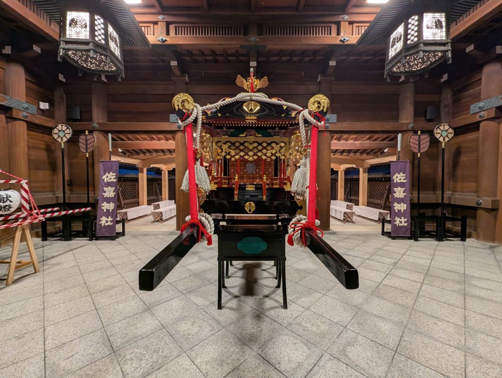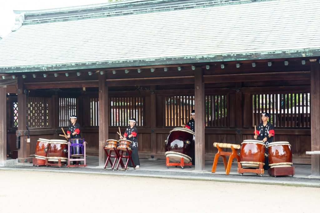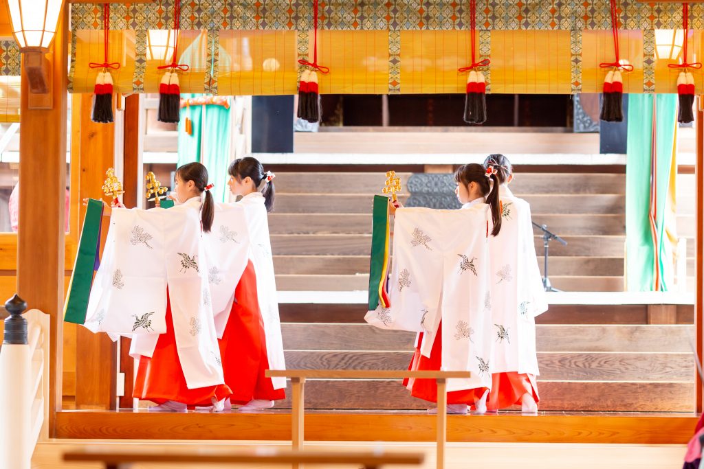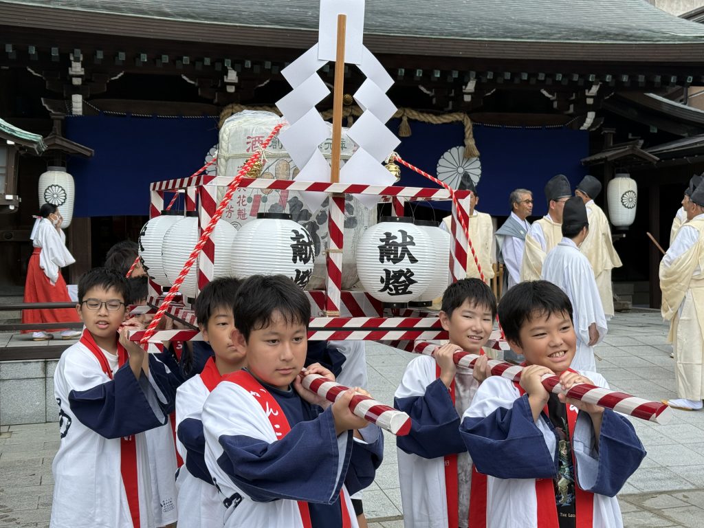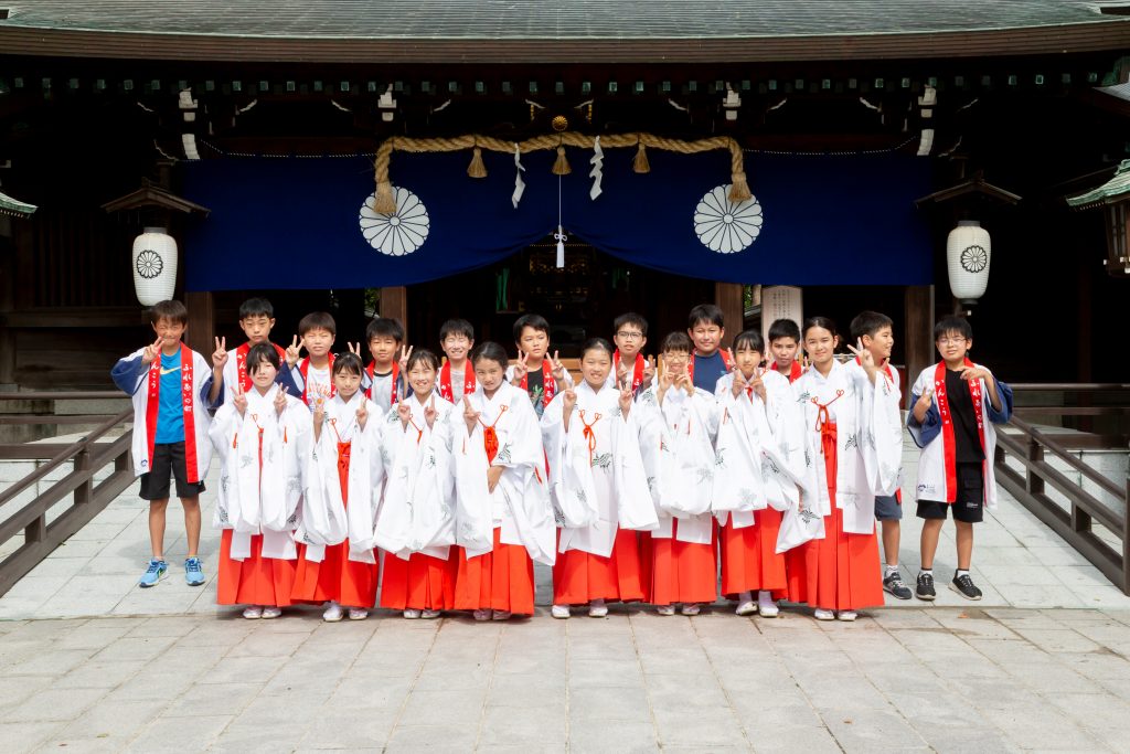 当日はあいにくの天気のため雨儀により執行し、神輿行列の巡行は取りやめとなりましたが、夏から練習を重ねてきた地元子ども会の小学生の女の子による「浦安の舞」や男の子の「子供みこし」、葉隠太鼓の奉納、神幸所役の崇敬者の皆さまなど多くの皆さまにご奉仕を頂き、また境内にはキッチンカーも出店する中、和やかなうちに滞りなく執り行う事が出来ました。