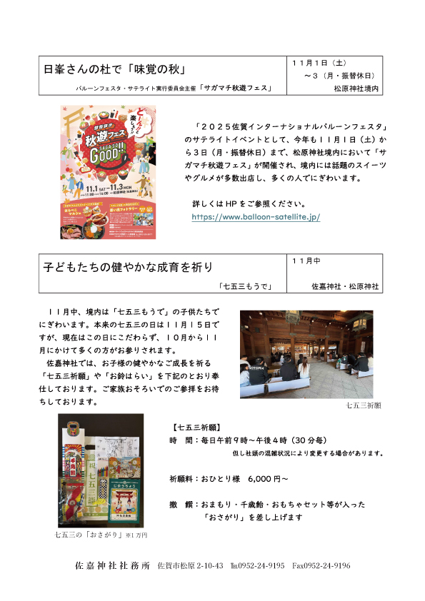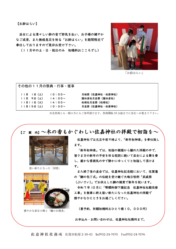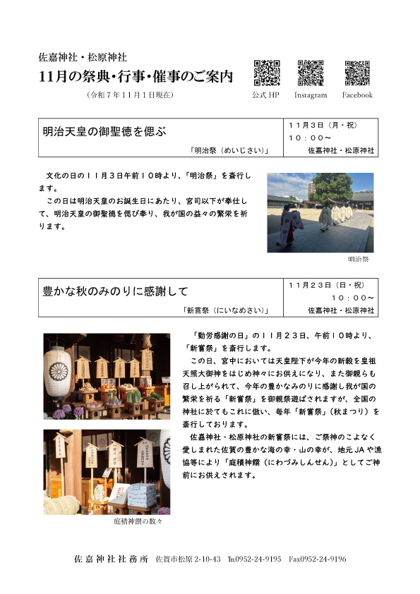 お知らせ 11月の祭典・行事・催事のご案内 2025年11月1日 カテゴリ すべて お祭り お知らせ 授与品 最近の記事 11月の祭典・行事・催事のご案内 (11/01) 【お知らせ】11月のご祈願について (10/24) 「幣饌料御下賜記念佐嘉神社社殿改修工事」が竣功しました (10/20) にぎやかに 秋の日峯さん (10/20) 神幸祭を斎行しました (10/20) 令和7年秋の山野草展 (10/19) 拝殿内特別参拝を実施します (10/07) 令和8年正月臨時巫女募集 (10/07) 本日の神幸祭は雨天のため行列を中止し、神社にて祭典のみ行います。 (10/04) 10月の祭典・行事・催事のご案内 (10/01) 過去記事 2025年 2024年 2023年