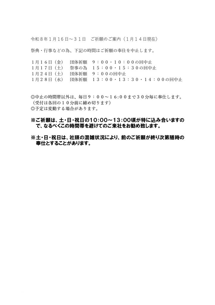 お知らせ 【お知らせ】1月後半のご祈願について 2026年1月14日 カテゴリ すべて お祭り お知らせ 授与品 最近の記事 【お知らせ】1月後半のご祈願について (01/14) 古いお札・お守りについて (01/09) ホームページを一部調整しています (01/09) 1月の祭典・行事・催事のご案内 (12/31) 【お知らせ】1月前半のご祈願について (12/24) ご鎮座100年啓発看板を設置しました (12/21) 御煤払祭を執り行いました (12/20) 大鳥居の修理を行っています (12/16) 令和8年初詣交通規制について (12/07) 12月の祭典・行事・催事のご案内 (12/01) 過去記事 2026年 2025年 2024年 2023年