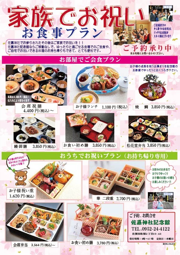 佐嘉神社でお参りをされたその後はご家族でお祝いのお食事はいかがですか。佐嘉神社記念館ならご移動なしで、ゆったりと過ごせるお部屋でのご会食、ご自宅でお祝いされる皆様も、すぐにお受取りが出来てとても便利にご利用いただけます。