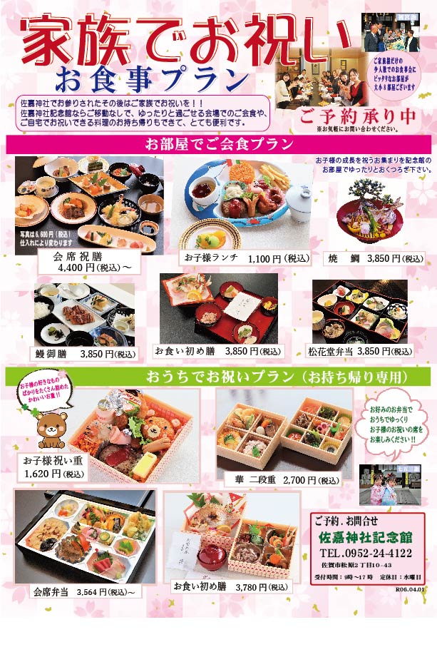 佐嘉神社でお参りをされたその後はご家族でお祝いのお食事はいかがですか。佐嘉神社記念館ならご移動なしで、ゆったりと過ごせるお部屋でのご会食、ご自宅でお祝いされる皆様も、すぐにお受取りが出来てとても便利にご利用いただけます。