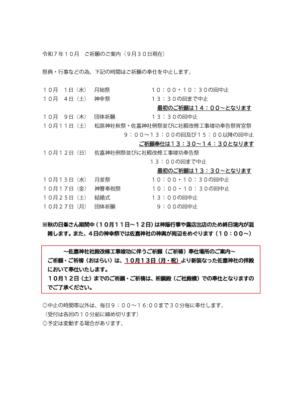 ③新しいご社殿でのご祈願・ご祈祷(おはらい)の奉仕は10月