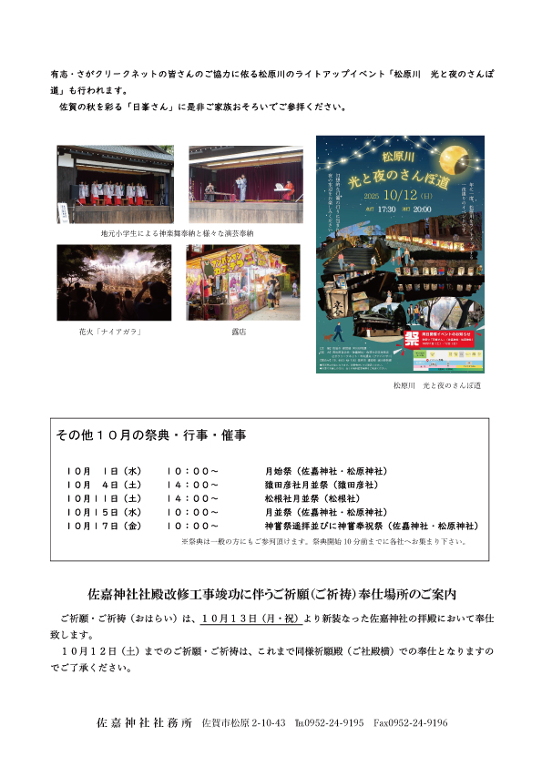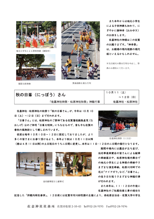 5月から進めて参りました「幣饌料御下賜記念 佐嘉神社社殿改修工事」も10月上旬で無事に完了し、10月12日の佐嘉神社例祭(秋の日峯さん)にあわせ、「竣功奉告祭」を執り行うこととなりました。